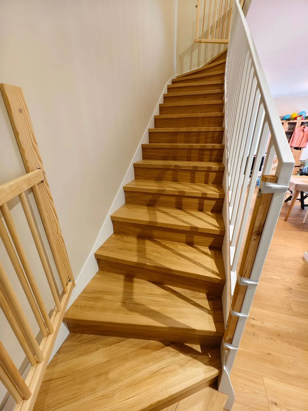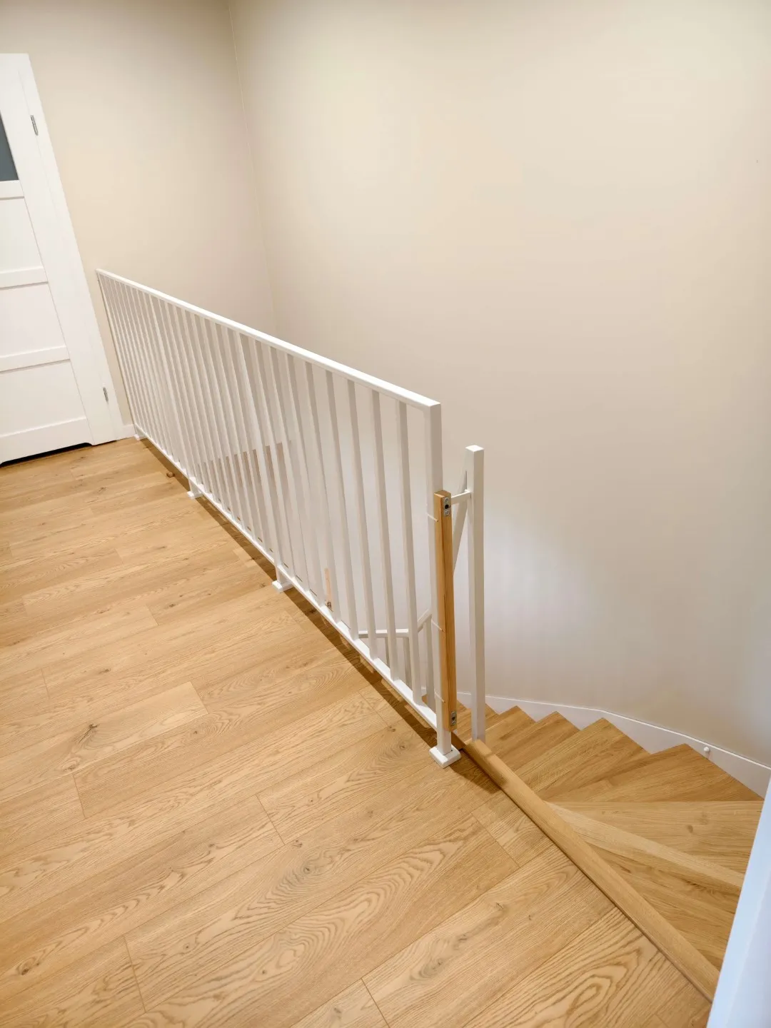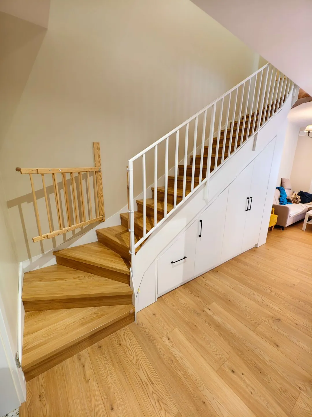 Dodatkowym wyzwaniem było zapewnienie bezpieczeństwa najmłodszym domownikom. W tym celu wykonaliśmy dedykowaną, drewnianą bramkę zabezpieczającą na dole schodów, która stylistycznie stanowi spójną całość z dębowymi stopniami.