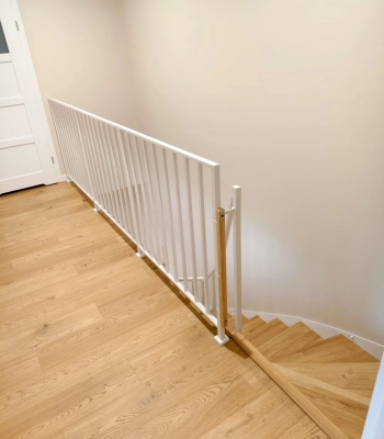 W tej realizacji w Radomiu połączyliśmy klasyczne ciepło naturalnego dębu z nowoczesną, minimalistyczną formą białej stali. Celem było stworzenie klatki schodowej, która jest nie tylko bezpieczna i wygodna, ale także maksymalnie funkcjonalna.
